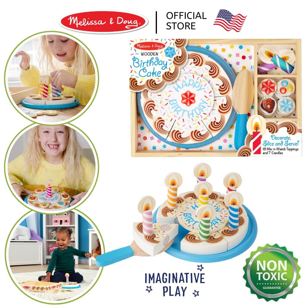 This wooden set includes six ready-to-cut slices of cake, removable candles and toppings, and a cake plate and server.